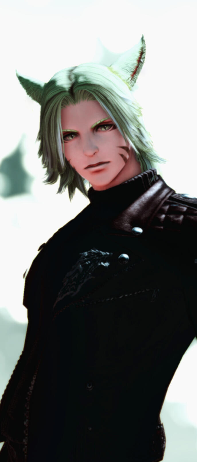 Description // Possessing aether green hair, Katsu stands at a height of 178 cm with a lean but muscular build. A number of scars cover his body from his time at war. The most apparent one being an old scar that goes over his right eye and down his cheek. Many of his scars are from challenges made against him by Nunhs and Tias alike. Weighing at roughly 76 kg, he will often rely on speed, agility, and his quick thinking when in combat.Compared to most Seekers in Eorzea, Katsu is a variant. Hailing from Gyr Abania, his ears are fluffier and larger than those typically seen for added regulation of his internal temperature. Surprisingly, he also possesses a set of double fangs in addition to a longer and thicker tail.