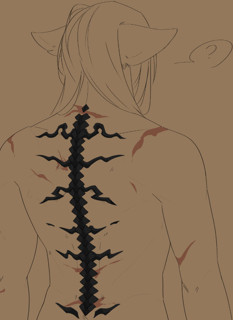 Magitek Implant - While not visible under normal circumstances, several large scars span across his lower back. Inflicted as a result of being caught in the blast of an IED during the Garlaen skirmishes, a large piece of shrapnel tore through his spine and paralyzed him from the waist down.W'akatsu has since received extensive treatment to repair what was damaged. While he has recovered some movement, he now has a magitek 'spine' attached to his back, overlapping his natural one and connecting the damaged vertebrae (C6 - C8, T11 - L1) to maintain function. Made from a black alloy, it is very discrete and barely rises above the skin making it unnoticeable beneath his clothes. Removable for maintenance, he rarely goes without it. When in place, he can move normally as though he were never injured.In the rare instances Katsu is not wearing it, he will be in extreme pain. During this, one might glimpse black 'ring-like' sockets on either side of each vertebra wherein the magitek spine attaches itself magnetically. When not worn, he sometimes experiences numbness down his left arm, wrist, and to the fourth and fifth digits (ring and little finger). If you listen closely, you might be able to hear the soft whirring of the magitek skeleton as Katsu walks.